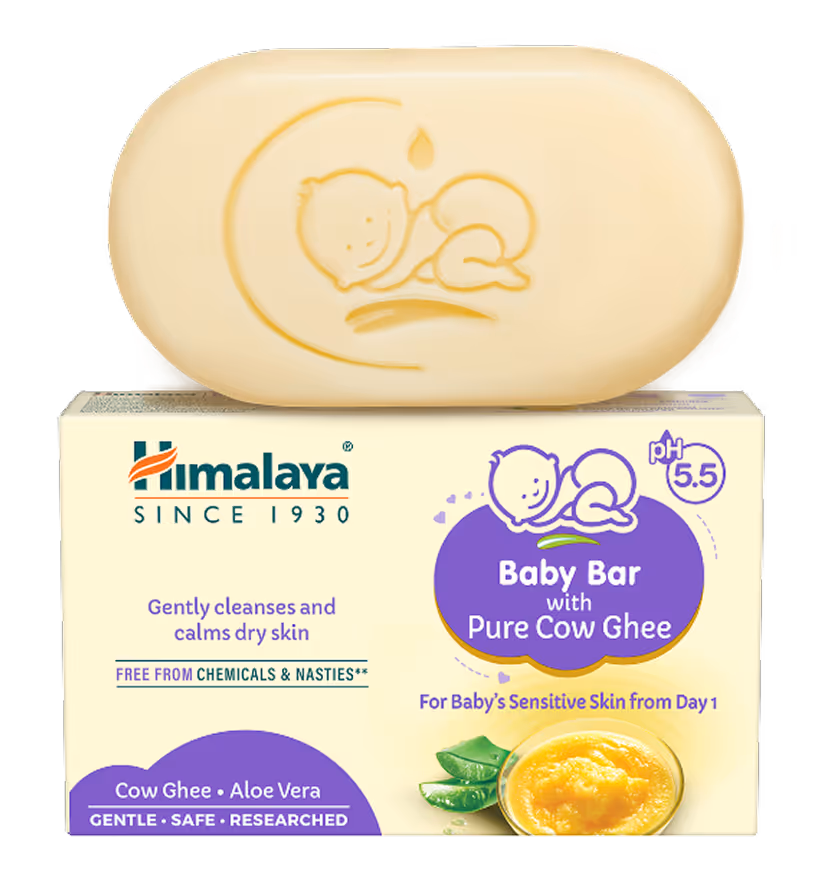 Wet baby’s body with lukewarm water, create a lather using Himalaya Baby Bar with Pure Cow Ghee in your hand, and gently apply on your baby’s body. Cleanse and rinse with water.