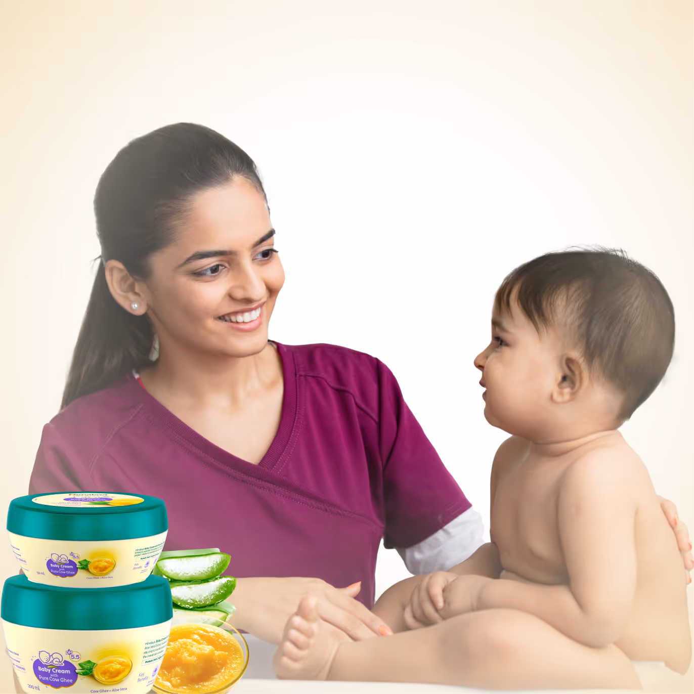 Baby Cream with Pure Cow Ghee moisturizes baby’s skin all day long.